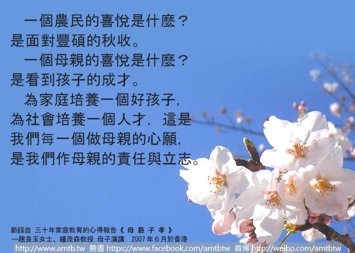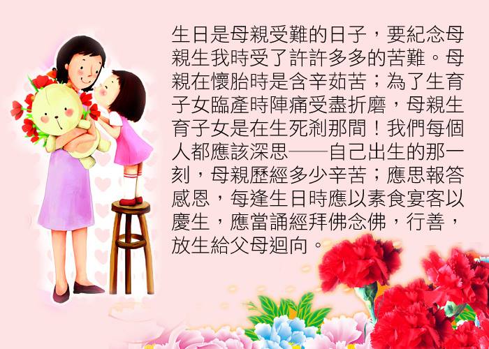 父母對孩子的關懷是一生一世,所謂「母活一百歲,常憂八 十兒」,母親已經一百歲,還是常常關心、想到自己八十歲 的孩子。