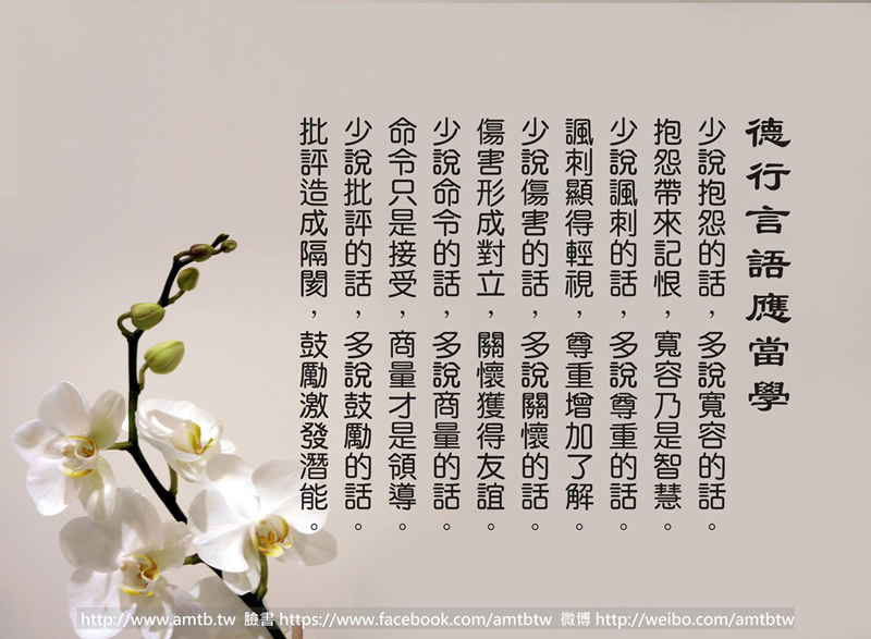 「同氣連枝各自榮」,就是說兄弟就好像同一棵樹延伸出來 的樹枝一樣。「些些言語莫傷情」,人與人相交往,家裡的 人最常溝通的就是用言語,所以言語要柔軟、和諧,絕對不 要講話很衝。《弟子規》也說「言語忍,忿自泯」,人與人 的衝突,一半以上都是因為言語不和。「一回相見一回老」 ,確確實實人在三、四十歲以後,每次看到兄弟姐妹都會有 這麼一點感觸,你的白髮多了一點。