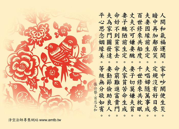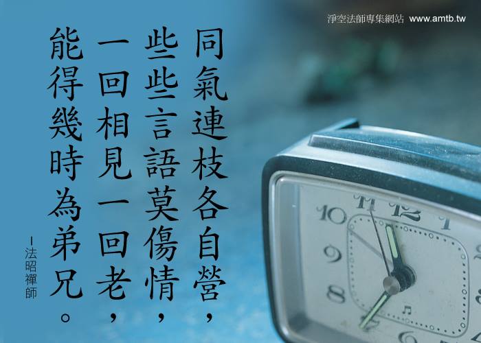 「能得幾時為弟兄」, 我們的年齡愈大也代表人生的路,就要走到盡頭了,要好好 珍惜這段情誼,所以「弟兄同居忍便安」,要懂得互相忍讓 、謙讓。「莫因毫末起爭端」,不要因小事而起爭執。「眼 前生子又兄弟」,眼前兄弟姐妹都有了孩子,其後輩也都是 兄弟姐妹,上一代應該做出兄友弟恭的榜樣,才能「留與兒 孫作樣看」,做出好榜樣令兒孫看。法昭禪師這首詩詞,值 得我們細細品味。
