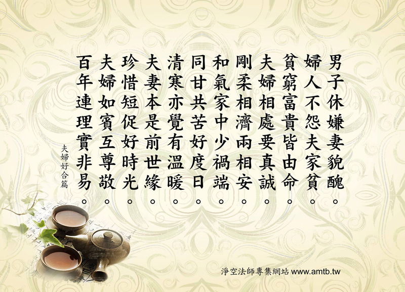 第二、「愛語」:要多給予對方肯定,多給予對方安慰的言 語。「愛語」不見得都是好聽的話,愛是真心關懷對方。太 太要能相夫教子,所以面對先生有過失時,也要給予規勸, 而規勸也要注意態度、方法。《弟子規》能不能解決夫妻問 題?可以!「善相勸,德皆建」、「見人善,即思齊」,你 都看對方的優點,他就會很喜悅。「恩欲報,怨欲忘」,時 時想著太太的辛勞,先生的辛勞,關係一定會很好。牙齒與 舌頭都會咬到,更何況是夫妻,怎麼可能沒有摩擦?但是要 「怨欲忘」。