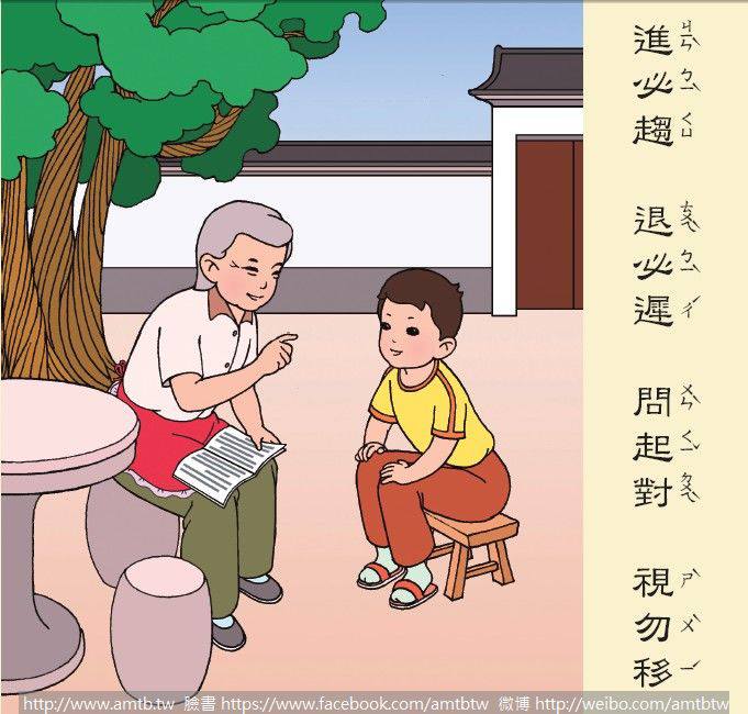 「進必趨,退必遲」,遇到長輩要快步上前,不要讓長輩等 太久;跟長輩談完話,要離開時,慢慢退幾步再轉身走出去 。你不能一講完話馬上就說:「好,再見」,立刻衝出門, 這樣好像告訴長輩,我恨不得馬上就走,不想再多留一秒, 這種感覺不好,因此要處處注意對方的感受。